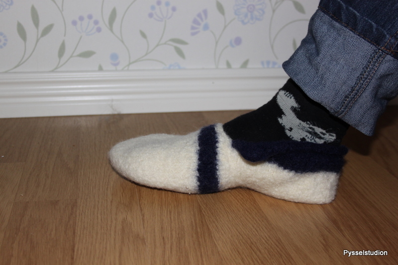 När de är färdigstickade stoppar man dem i tvättmaskinen, sen har man ett par tovade tofflor!